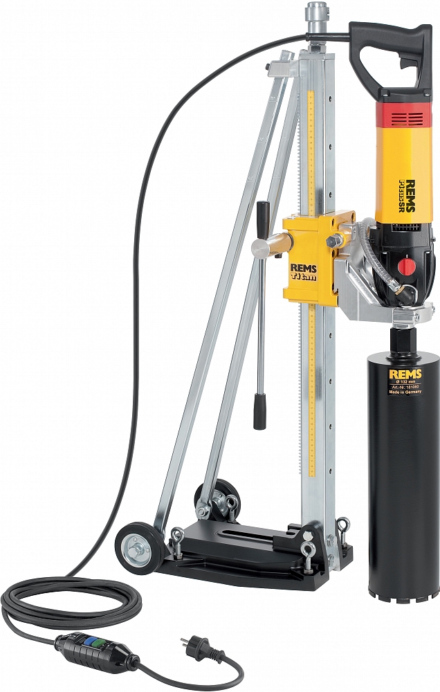 Rems Пикус SR базовый пакет со стойкой Rems Титан, включая комплект крепежа для кирпичной кладки и бетона и универсальные алмазные коронки для сверления Rems UDKB Ø 62 – 82 – 132 мм. Другие сетевые напряжения по запросу.