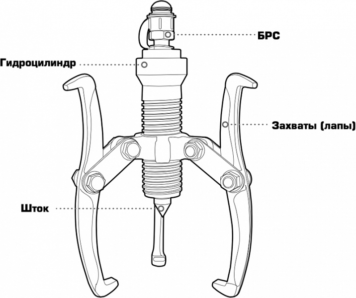 - Съемник гидравлический состоит из корпуса гидроцилиндра, упорного штока, захватов (лап) и быстроразъемного соединения (БРС). Внешний насос подключается к съемнику с помощью рукава высокого давления через БРС. Подача рабочей жидкости в полость гидроцилиндра съемника под давлением происходит за счет приведения в работу внешнего гидравлического насоса.